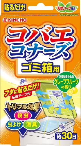 ごみ箱のフタの裏に貼るだけの簡単設置でごみ箱内に発生したごみを好む性質のコバエを殺虫してくれるアイテムです。殺虫の他にコバエを寄せ付けない虫除けの効果とごみのイヤなにおいを消臭してくれる効果もあります。